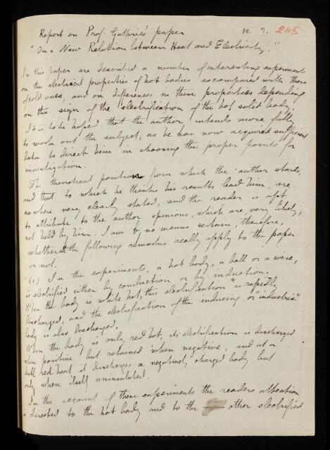 James Clerk Maxwell, Referee's report by James Clerk Maxwell, on a paper 'On a new relation between heat and electricity' by Frederick Guthrie, 1873, RR/7/245, The Royal Society Archives, London, https://makingscience.royalsociety.org/items/rr_7_245/referees-report-by-james-clerk-maxwell-on-a-paper-on-a-new-relation-between-heat-and-electricity-by-frederick-guthrie, accessed on 25 January 2026