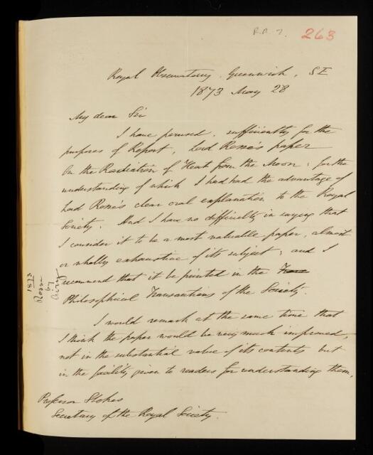 George Biddell Airy, Referee's report by George Biddell Airy, on a paper 'On the radiation of heat from the moon, the law of its absorption by our atmosphere, and of its variation in amount with her phases' by Laurence Parsons, Earl of Rosse, 29 May 1873, RR/7/263, The Royal Society Archives, London, https://makingscience.royalsociety.org/items/rr_7_263/referees-report-by-george-biddell-airy-on-a-paper-on-the-radiation-of-heat-from-the-moon-the-law-of-its-absorption-by-our-atmosphere-and-of-its-variation-in-amount-with-her-phases-by-laurence-parsons-earl-of-rosse, accessed on 08 December 2025