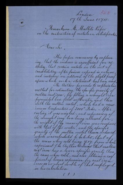 Charles William Siemens, Referee's report by Charles William Siemens, on a paper 'On the alleged expansion in volume of various substances in passing by refrigeration from the state of liquid fusion to that of solidification' by Robert Mallet, 17 June 1874, RR/7/328, The Royal Society Archives, London, https://makingscience.royalsociety.org/items/rr_7_328/referees-report-by-charles-william-siemens-on-a-paper-on-the-alleged-expansion-in-volume-of-various-substances-in-passing-by-refrigeration-from-the-state-of-liquid-fusion-to-that-of-solidification-by-robert-mallet, accessed on 10 December 2025