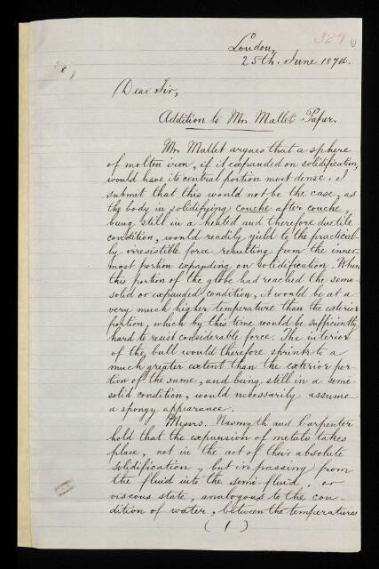 Charles William Siemens, Referee's report by Charles William Siemens, on a paper 'On the alleged expansion in volume of various substances in passing by refrigeration from the state of liquid fusion to that of solidification' by Robert Mallet, 25 June 1874, RR/7/329, The Royal Society Archives, London, https://makingscience.royalsociety.org/items/rr_7_329/referees-report-by-charles-william-siemens-on-a-paper-on-the-alleged-expansion-in-volume-of-various-substances-in-passing-by-refrigeration-from-the-state-of-liquid-fusion-to-that-of-solidification-by-robert-mallet, accessed on 21 January 2026