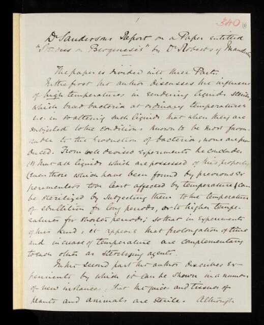 John Scott Burdon-Sanderson, Referee's report by John Scott Burdon-Sanderson, on a paper 'Studies on biogenesis' by William Roberts, 27 May 1874, RR/7/340, The Royal Society Archives, London, https://makingscience.royalsociety.org/items/rr_7_340/referees-report-by-john-scott-burdon-sanderson-on-a-paper-studies-on-biogenesis-by-william-roberts, accessed on 14 November 2025