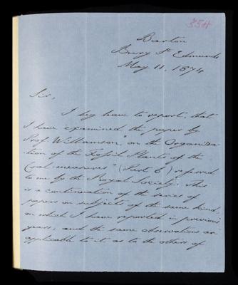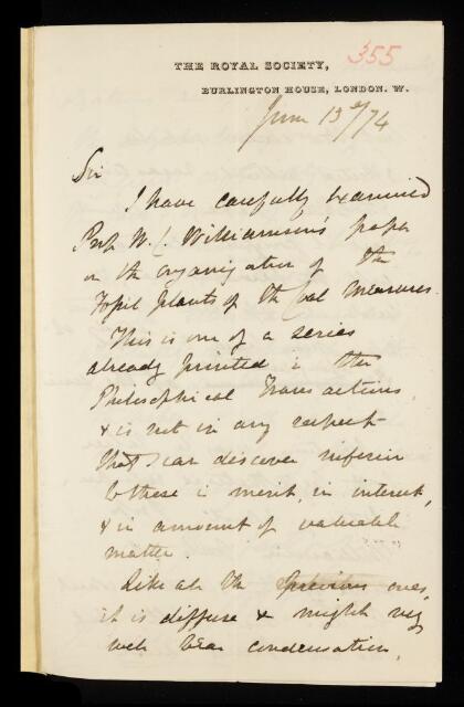 Joseph Dalton Hooker, Referee's report by Joseph Dalton Hooker, on a paper 'On the organization of the fossil plants of the coal-measures. Part VI - Ferns' by William Crawford Williamson, 13 June 1874, RR/7/355, The Royal Society Archives, London, https://makingscience.royalsociety.org/items/rr_7_355/referees-report-by-joseph-dalton-hooker-on-a-paper-on-the-organization-of-the-fossil-plants-of-the-coal-measures-part-vi-ferns-by-william-crawford-williamson, accessed on 21 January 2026