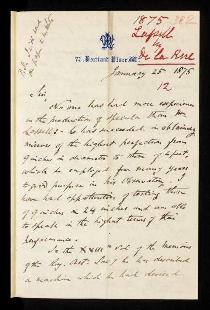 Warren de la Rue, Referee's report by Warren De La Rue, on a paper 'On polishing the specula of reflecting telescopes' by William Lassell, 25 January 1875, RR/7/382, The Royal Society Archives, London, https://makingscience.royalsociety.org/items/rr_7_382/referees-report-by-warren-de-la-rue-on-a-paper-on-polishing-the-specula-of-reflecting-telescopes-by-william-lassell, accessed on 13 November 2025