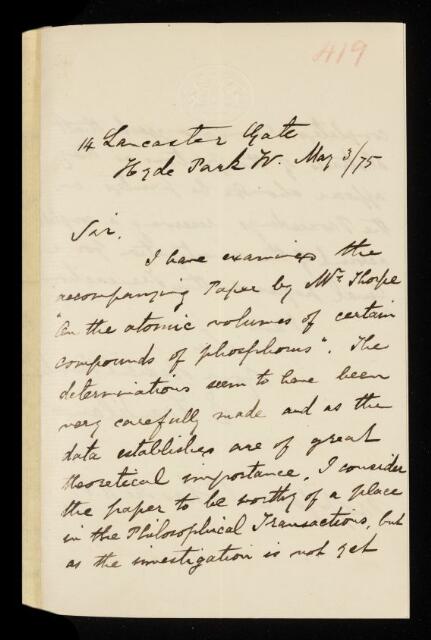 Edward Frankland, Referee's report by Edward Frankland, on a paper 'On the atomic volumes of certain compounds of phosphorus' by Thomas Edward Thorpe, 03 May 1875, RR/7/419, The Royal Society Archives, London, https://makingscience.royalsociety.org/items/rr_7_419/referees-report-by-edward-frankland-on-a-paper-on-the-atomic-volumes-of-certain-compounds-of-phosphorus-by-thomas-edward-thorpe, accessed on 10 November 2025