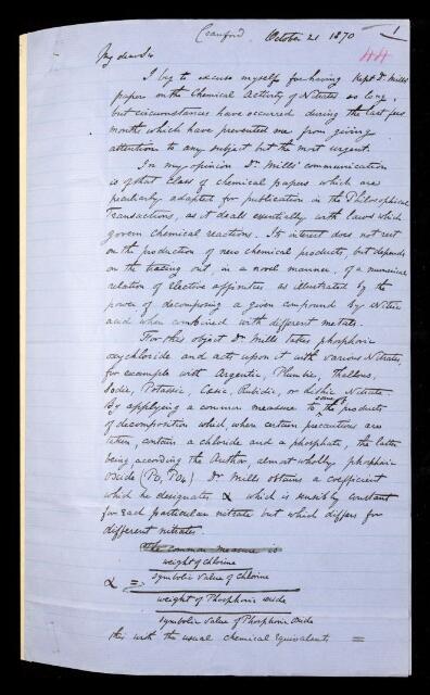 Warren de la Rue, Referee's report by Warren De La Rue, on a paper 'On the chemical activity of nitrates' by Edmund James Mills, 21 October 1870, RR/7/44, The Royal Society Archives, London, https://makingscience.royalsociety.org/items/rr_7_44/referees-report-by-warren-de-la-rue-on-a-paper-on-the-chemical-activity-of-nitrates-by-edmund-james-mills, accessed on 17 March 2026