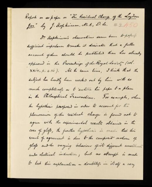 George Carey Foster, Referee's report by George Carey Foster, on a paper 'The residual charge of the Leyden jar' by John Hopkinson, 14 June 1876, RR/7/450, The Royal Society Archives, London, https://makingscience.royalsociety.org/items/rr_7_450/referees-report-by-george-carey-foster-on-a-paper-the-residual-charge-of-the-leyden-jar-by-john-hopkinson, accessed on 12 December 2025