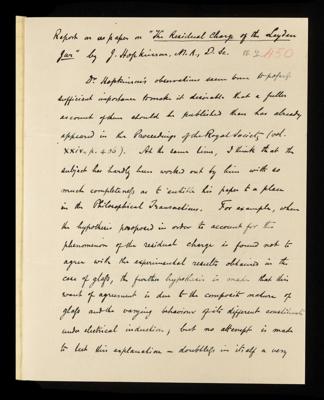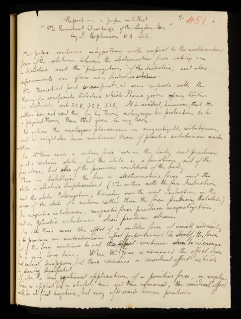 James Clerk Maxwell, Referee's report by James Clerk Maxwell, on a paper 'The residual charge of the Leyden jar' by John Hopkinson, 1876, RR/7/451, The Royal Society Archives, London, https://makingscience.royalsociety.org/items/rr_7_451/referees-report-by-james-clerk-maxwell-on-a-paper-the-residual-charge-of-the-leyden-jar-by-john-hopkinson, accessed on 10 December 2025