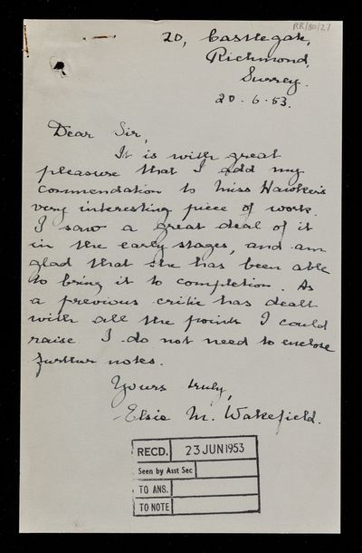 Richard William George Dennis, Letter from Richard William George Dennis, on a paper 'British hypogeous fungi' by Lilian E Hawker, to D C Martin, 31 May 1953, RR/80/25, The Royal Society Archives, London, https://makingscience.royalsociety.org/items/rr_80_25/letter-from-richard-william-george-dennis-on-a-paper-british-hypogeous-fungi-by-lilian-e-hawker-to-d-c-martin, accessed on 12 March 2026