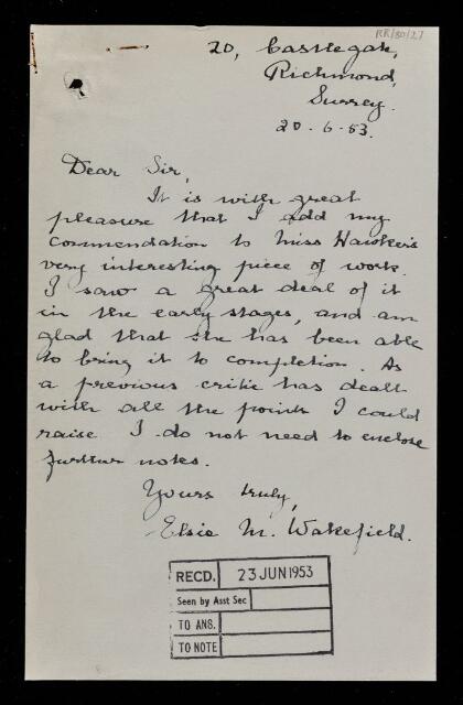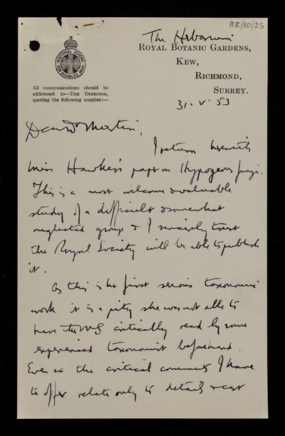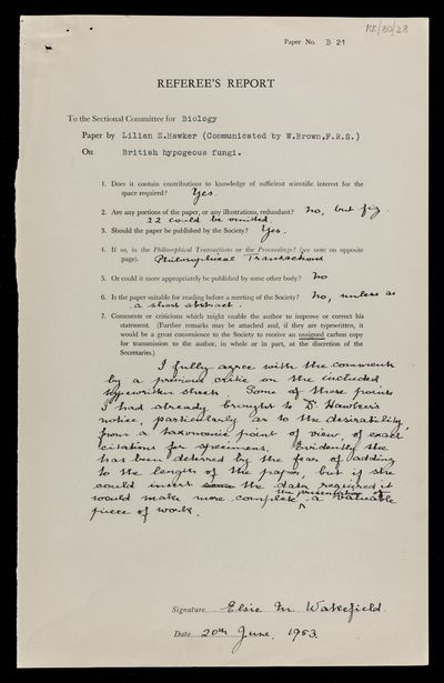 Letter from Elsie M Wakefield, on a paper 'British hypogeous fungi' by Lilian E Hawker, to [the Royal Society], 20 June 1953, RR/80/27, The Royal Society Archives, London, https://makingscience.royalsociety.org/items/rr_80_27/letter-from-elsie-m-wakefield-on-a-paper-british-hypogeous-fungi-by-lilian-e-hawker-to-the-royal-society, accessed on 08 February 2026