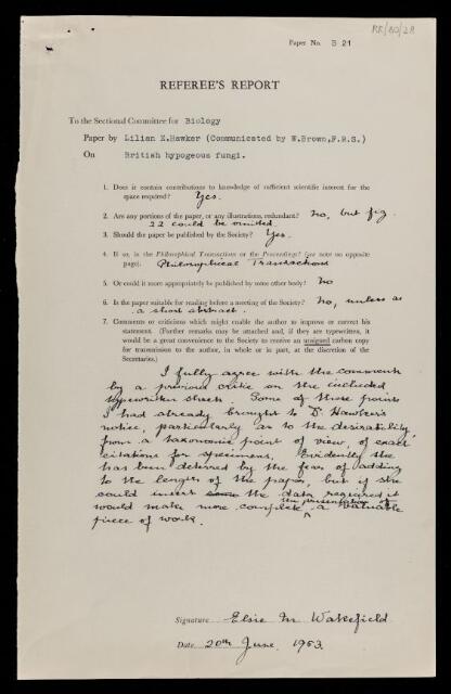 Elsie Maud Wakefield, Referee's report by Elsie M Wakefield, on a paper 'British hypogeous fungi' by Lilian E Hawker, 20 June 1953, RR/80/28, The Royal Society Archives, London, https://makingscience.royalsociety.org/items/rr_80_28/referees-report-by-elsie-m-wakefield-on-a-paper-british-hypogeous-fungi-by-lilian-e-hawker, accessed on 07 March 2026