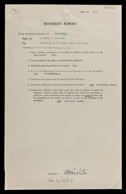William Albert Hugh Rushton, Referee's report by William Albert Hugh Rushton, on a paper 'Variations of the latent period of vision' by G B Arden and R A Weale, 06 October 1953, RR/80/40, The Royal Society Archives, London, https://makingscience.royalsociety.org/items/rr_80_40/referees-report-by-william-albert-hugh-rushton-on-a-paper-variations-of-the-latent-period-of-vision-by-g-b-arden-and-r-a-weale, accessed on 08 March 2026
