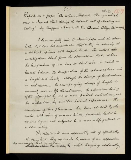 George Carey Foster, Referee's report by George Carey Foster, on a paper 'On certain molecular changes which occur in iron and steel during the separate acts of heating and cooling' by Professor Norris, 03 January 1878, RR/8/129, The Royal Society Archives, London, https://makingscience.royalsociety.org/items/rr_8_129/referees-report-by-george-carey-foster-on-a-paper-on-certain-molecular-changes-which-occur-in-iron-and-steel-during-the-separate-acts-of-heating-and-cooling-by-professor-norris, accessed on 09 March 2026