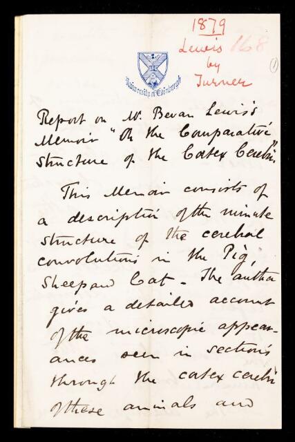 William Turner, Referee's report by William Turner, on a paper 'Researches on the comparative structure of the cortex cerebri' by William Bevan Lewis, 05 July 1879, RR/8/168, The Royal Society Archives, London, https://makingscience.royalsociety.org/items/rr_8_168/referees-report-by-william-turner-on-a-paper-researches-on-the-comparative-structure-of-the-cortex-cerebri-by-william-bevan-lewis, accessed on 10 November 2025