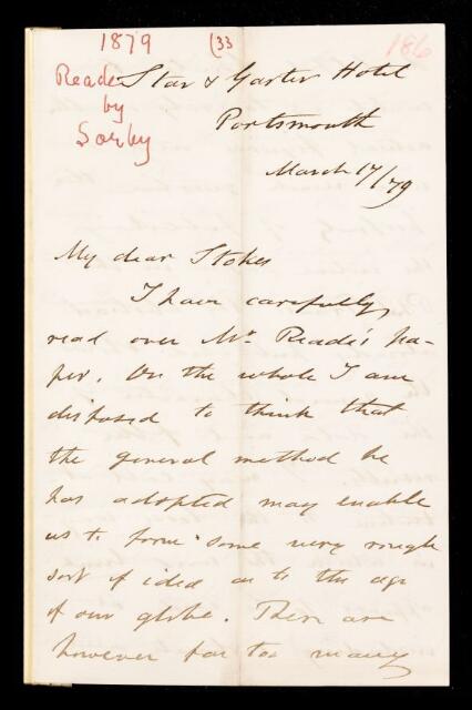 Henry Clifton Sorby, Referee's report by Henry Clifton Sorby, on a paper 'Limestone as an index of geological time' by Thomas Mellard Reade, 17 March 1879, RR/8/186, The Royal Society Archives, London, https://makingscience.royalsociety.org/items/rr_8_186/referees-report-by-henry-clifton-sorby-on-a-paper-limestone-as-an-index-of-geological-time-by-thomas-mellard-reade, accessed on 25 January 2026