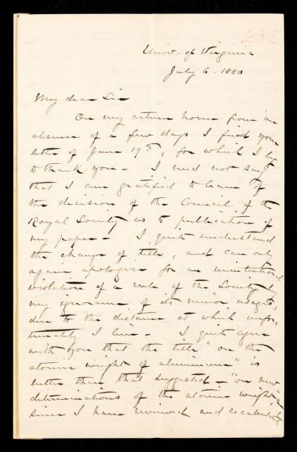 Letter from John William Mallet, to George Gabriel Stokes, regarding a paper 'Revision of the atomic weight of aluminum' by John William Mallet, 06 July 1880, RR/8/235, The Royal Society Archives, London, https://makingscience.royalsociety.org/items/rr_8_235/letter-from-john-william-mallet-to-george-gabriel-stokes-regarding-a-paper-revision-of-the-atomic-weight-of-aluminum-by-john-william-mallet, accessed on 16 November 2025