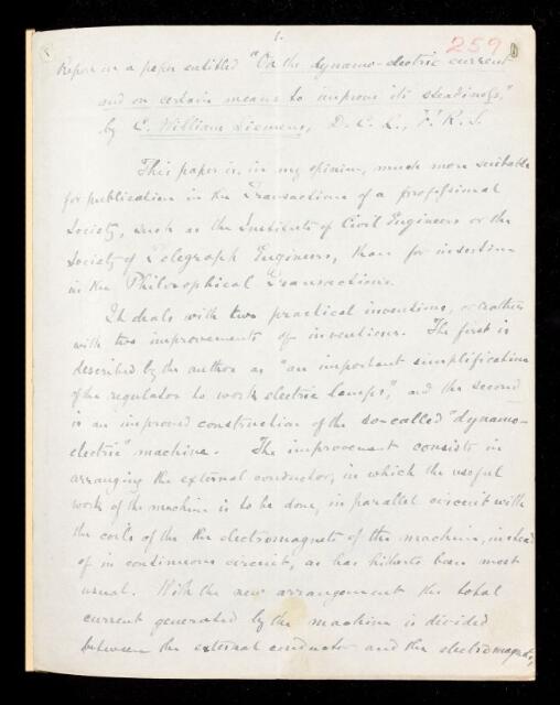 George Carey Foster, Referee's report by George Carey Foster, on a paper 'On the dynamo-electric current, and on certain means to improve its steadiness' by Charles William Siemens, 04 October 1880, RR/8/259, The Royal Society Archives, London, https://makingscience.royalsociety.org/items/rr_8_259/referees-report-by-george-carey-foster-on-a-paper-on-the-dynamo-electric-current-and-on-certain-means-to-improve-its-steadiness-by-charles-william-siemens, accessed on 15 January 2026