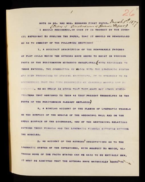 John Scott Burdon-Sanderson, Referee's report by John Scott Burdon-Sanderson, on a paper 'Lymphatics and their origin in muscular tissues' by George Hoggan and Frances Elizabeth Hoggan, 01 March 1877, RR/8/26, The Royal Society Archives, London, https://makingscience.royalsociety.org/items/rr_8_26/referees-report-by-john-scott-burdon-sanderson-on-a-paper-lymphatics-and-their-origin-in-muscular-tissues-by-george-hoggan-and-frances-elizabeth-hoggan, accessed on 10 February 2026