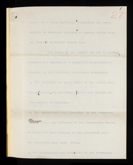 Unpublished paper, 'Lymphatics and their origins on muscular tissues' by George Hoggan and Frances Elizabeth Hoggan