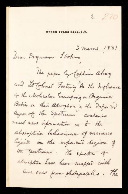 William Huggins, Referee's report by William Huggins, on a paper 'On the influence of the atomic grouping in the molecules of organic bodies on their absorption in the infra-red region of the spectrum' by William de Wiveleslie Abney and Edward Robert Festing, 03 March 1881, RR/8/270, The Royal Society Archives, London, https://makingscience.royalsociety.org/items/rr_8_270/referees-report-by-william-huggins-on-a-paper-on-the-influence-of-the-atomic-grouping-in-the-molecules-of-organic-bodies-on-their-absorption-in-the-infra-red-region-of-the-spectrum-by-william-de-wiveleslie-abney-and-edward-robert-festing, accessed on 06 March 2026