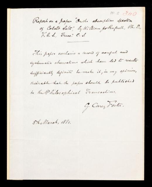 George Carey Foster, Referee's report by George Carey Foster, on a paper 'On the absorption spectra of cobalt salts' by William James Russell, 05 March 1881, RR/8/340, The Royal Society Archives, London, https://makingscience.royalsociety.org/items/rr_8_340/referees-report-by-george-carey-foster-on-a-paper-on-the-absorption-spectra-of-cobalt-salts-by-william-james-russell, accessed on 10 December 2025