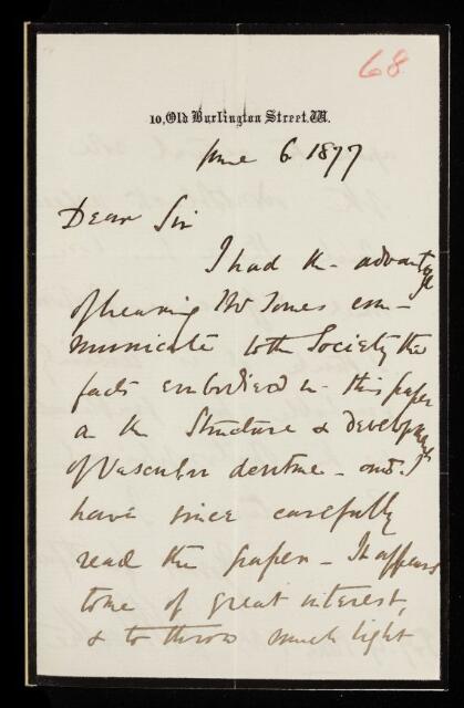 John Whitaker Hulke, Referee's report by John Whitaker Hulke, on a paper 'On the structure and development of vascular dentine' by Charles Sissmore Tomes, 06 June 1877, RR/8/68, The Royal Society Archives, London, https://makingscience.royalsociety.org/items/rr_8_68/referees-report-by-john-whitaker-hulke-on-a-paper-on-the-structure-and-development-of-vascular-dentine-by-charles-sissmore-tomes, accessed on 17 March 2026