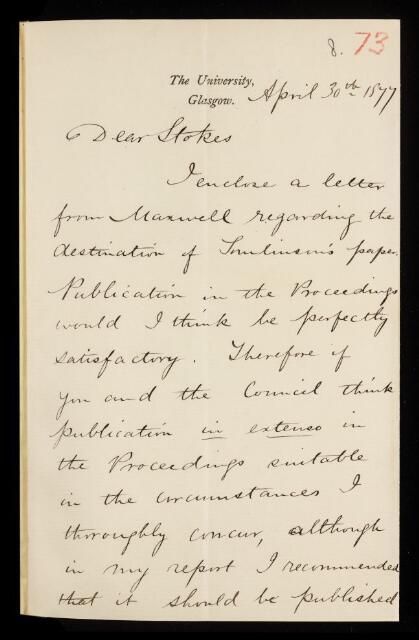 William Thomson, Letter from William Thomson, Lord Kelvin, to George Gabriel Stokes, regarding a paper 'On the increase in resistance to the passage of an electric current produced on certain wires by stretching' by Herbert Tomlinson, 30 April 1877, RR/8/73, The Royal Society Archives, London, https://makingscience.royalsociety.org/items/rr_8_73/letter-from-william-thomson-lord-kelvin-to-george-gabriel-stokes-regarding-a-paper-on-the-increase-in-resistance-to-the-passage-of-an-electric-current-produced-on-certain-wires-by-stretching-by-herbert-tomlinson, accessed on 09 March 2026