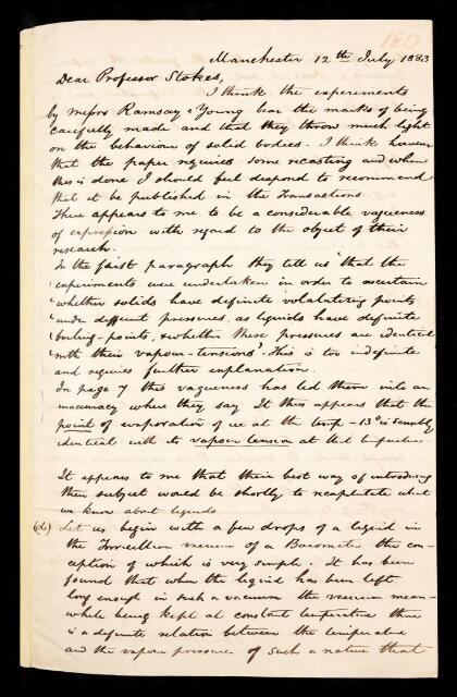 Balfour Stewart, Referee's report by Balfour Stewart, on a paper 'The influence of pressure on the temperature of volatilization of solids' by William Ramsay and Sydney Young, 12 July 1883, RR/9/180, The Royal Society Archives, London, https://makingscience.royalsociety.org/items/rr_9_180/referees-report-by-balfour-stewart-on-a-paper-the-influence-of-pressure-on-the-temperature-of-volatilization-of-solids-by-william-ramsay-and-sydney-young, accessed on 14 April 2026