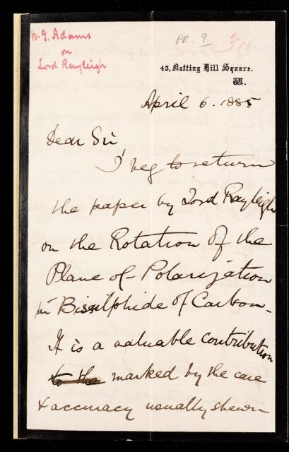 William Grylls Adams, Referee's report by William Grylls Adams, on a paper 'On the constant of electromagnetic rotation of light in bisulphide of carbon' by John William Strutt, Lord Rayleigh, 06 April 1885, RR/9/311, The Royal Society Archives, London, https://makingscience.royalsociety.org/items/rr_9_311/referees-report-by-william-grylls-adams-on-a-paper-on-the-constant-of-electromagnetic-rotation-of-light-in-bisulphide-of-carbon-by-john-william-strutt-lord-rayleigh, accessed on 08 December 2025