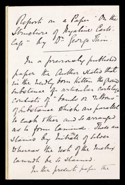 Referee's report by John Scott Burdon-Sanderson, on a paper 'On the structure of hyaline cartilage' by George Thin