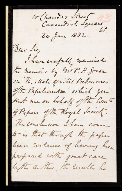 Osbert Salvin, Referee's report by Osbert Salvin, on a paper 'The prehensores of male butterflies of the genera Ornithoptera and Papilo' by Philip Henry Gosse, 30 January 1882, RR/9/43, The Royal Society Archives, London, https://makingscience.royalsociety.org/items/rr_9_43/referees-report-by-osbert-salvin-on-a-paper-the-prehensores-of-male-butterflies-of-the-genera-ornithoptera-and-papilo-by-philip-henry-gosse, accessed on 23 January 2026