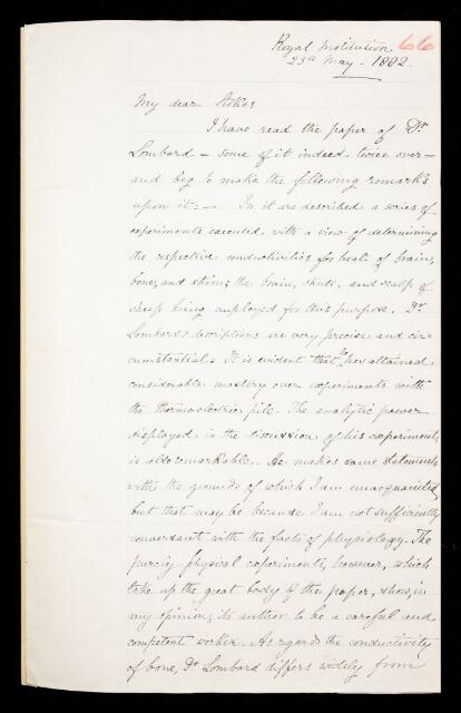 John Tyndall, Referee's report by John Tyndall, on a paper 'Experimental researches on the propagation of heat by conduction in bone, brain-tissue, and skin' by J S Lombard, 23 May 1882, RR/9/66, The Royal Society Archives, London, https://makingscience.royalsociety.org/items/rr_9_66/referees-report-by-john-tyndall-on-a-paper-experimental-researches-on-the-propagation-of-heat-by-conduction-in-bone-brain-tissue-and-skin-by-j-s-lombard, accessed on 09 March 2026