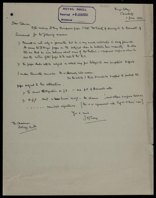 Letter from [James] Gray to [William Thomas] Calman, Chairman of the Zoology Committee, regarding a paper 'The geometry of the siliceous skeletons of the radiolaria' by D'Arcy Wentworth Thompson, 01 June 1932, RR/W/1/10, The Royal Society Archives, London, https://makingscience.royalsociety.org/items/rr_w_1_10/letter-from-james-gray-to-william-thomas-calman-chairman-of-the-zoology-committee-regarding-a-paper-the-geometry-of-the-siliceous-skeletons-of-the-radiolaria-by-darcy-wentworth-thompson, accessed on 25 January 2026