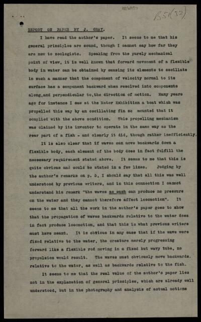 Geoffrey Ingram Taylor, Copy of referee's report [by Geoffrey Ingram Taylor], on a paper 'Studies in animal movement, I. The movements of fish with special reference to the eel' by James Gray, 20 August 1932, RR/W/1/23, The Royal Society Archives, London, https://makingscience.royalsociety.org/items/rr_w_1_23/copy-of-referees-report-by-geoffrey-ingram-taylor-on-a-paper-studies-in-animal-movement-i-the-movements-of-fish-with-special-reference-to-the-eel-by-james-gray, accessed on 21 January 2026