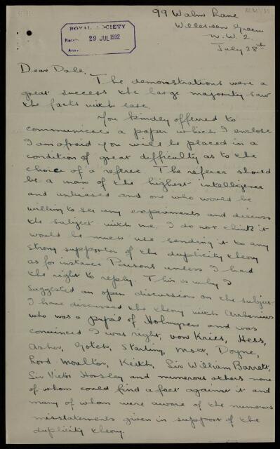 Letter from F W [Frederick William] Edridge-Green to [Henry] Dale, regarding a paper 'The theory of vision' by Edridge-Green, 28 July 1932, RR/W/1/30, The Royal Society Archives, London, https://makingscience.royalsociety.org/items/rr_w_1_30/letter-from-f-w-frederick-william-edridge-green-to-henry-dale-regarding-a-paper-the-theory-of-vision-by-edridge-green, accessed on 07 December 2025