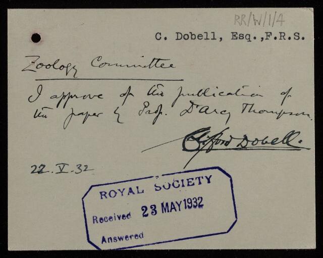 Postcard from [Cecil Clifford] Dobell to the Assistant Secretary of the Royal Society, regarding a paper 'The geometry of the siliceous skeletons of the radiolaria' by D'Arcy Wentworth Thompson, 22 May 1932, RR/W/1/4, The Royal Society Archives, London, https://makingscience.royalsociety.org/items/rr_w_1_4/postcard-from-cecil-clifford-dobell-to-the-assistant-secretary-of-the-royal-society-regarding-a-paper-the-geometry-of-the-siliceous-skeletons-of-the-radiolaria-by-darcy-wentworth-thompson, accessed on 25 January 2026