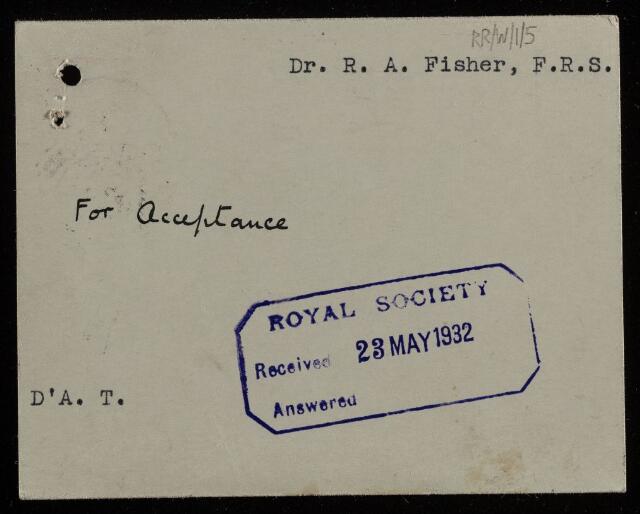 Postcard from [Ronald Aylmer] Fisher to the Assistant Secretary of the Royal Society, regarding a paper 'The geometry of the siliceous skeletons of the radiolaria' by D'Arcy Wentworth Thompson, 21 May 1932, RR/W/1/5, The Royal Society Archives, London, https://makingscience.royalsociety.org/items/rr_w_1_5/postcard-from-ronald-aylmer-fisher-to-the-assistant-secretary-of-the-royal-society-regarding-a-paper-the-geometry-of-the-siliceous-skeletons-of-the-radiolaria-by-darcy-wentworth-thompson, accessed on 25 January 2026