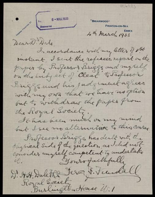 Letter from [Percy Fry] Kendall to [Sir Henry Hallett] Dale, regarding a paper 'The Formation of Rock Joints and the Cleat of Coal' by Kendall and [Henry] Briggs, 04 March 1933, RR/W/1/55, The Royal Society Archives, London, https://makingscience.royalsociety.org/items/rr_w_1_55/letter-from-percy-fry-kendall-to-sir-henry-hallett-dale-regarding-a-paper-the-formation-of-rock-joints-and-the-cleat-of-coal-by-kendall-and-henry-briggs, accessed on 19 April 2026