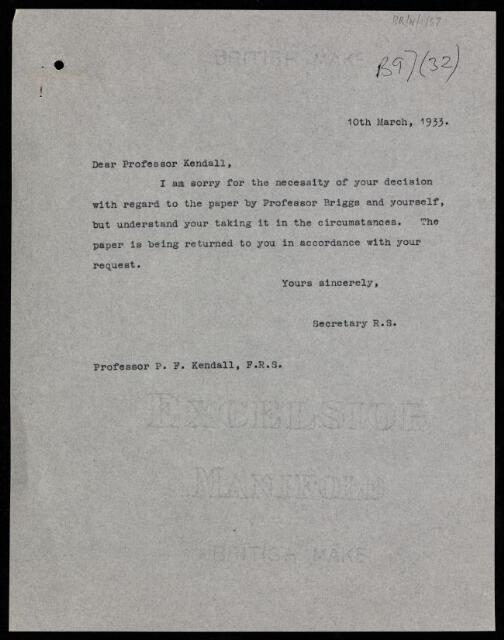 Letter from the Secretary of the Royal Society to [Percy Fry] Kendall, regarding a paper 'The Formation of Rock Joints and the Cleat of Coal' by Kendall and [Henry] Briggs, 10 March 1933, RR/W/1/57, The Royal Society Archives, London, https://makingscience.royalsociety.org/items/rr_w_1_57/letter-from-the-secretary-of-the-royal-society-to-percy-fry-kendall-regarding-a-paper-the-formation-of-rock-joints-and-the-cleat-of-coal-by-kendall-and-henry-briggs, accessed on 17 April 2026