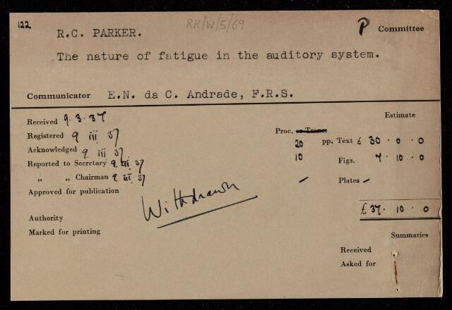 Hamilton Hartridge, Frederic Charles Bartlett, Original summary note from the Royal Society editorial department, for a paper 'The nature of fatigue in the auditory system' by [Raymond] C Parker, 09 March 1937, RR/W/5/69, The Royal Society Archives, London, https://makingscience.royalsociety.org/items/rr_w_5_69/original-summary-note-from-the-royal-society-editorial-department-for-a-paper-the-nature-of-fatigue-in-the-auditory-system-by-raymond-c-parker, accessed on 09 December 2025