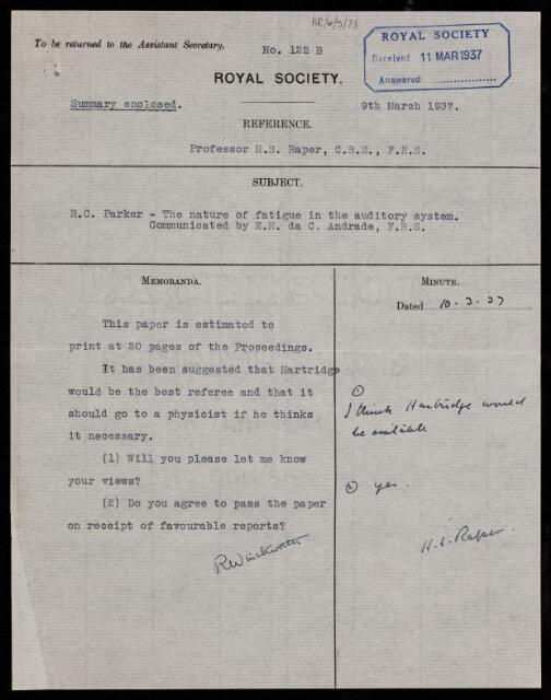Hamilton Hartridge, Ronald Winckworth, Memorandum from [Ronald] Winckworth to [Henry Stanley] Raper, regarding a paper 'The nature of fatigue in the auditory system' by [Raymond] C Parker, 09 March 1937, RR/W/5/73, The Royal Society Archives, London, https://makingscience.royalsociety.org/items/rr_w_5_73/memorandum-from-ronald-winckworth-to-henry-stanley-raper-regarding-a-paper-the-nature-of-fatigue-in-the-auditory-system-by-raymond-c-parker, accessed on 05 December 2025
