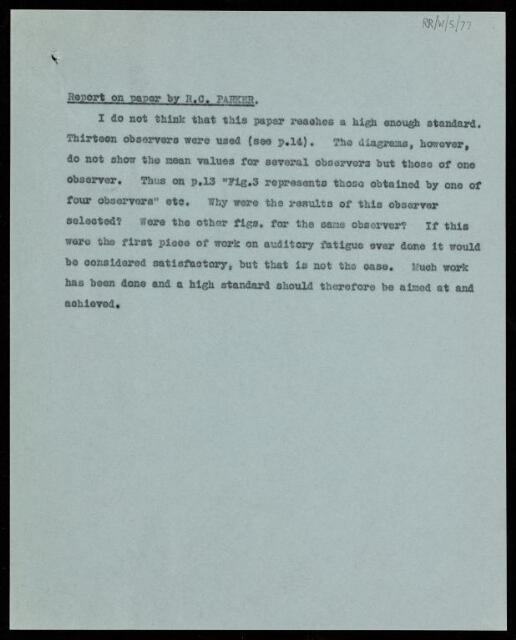 Referee's report by Frederic Charles Bartlett, on a paper 'The nature of fatigue in the auditory system' by R C Parker