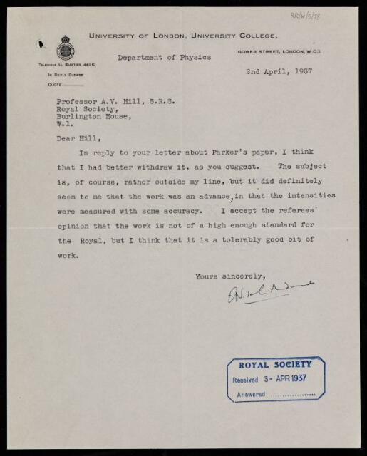 Letter from [Edward Neville da Costa] Andrade to [Archibald Vivian] Hill, regarding a paper 'The nature of fatigue in the auditory system' by [Raymond] C Parker, 02 April 1937, RR/W/5/78, The Royal Society Archives, London, https://makingscience.royalsociety.org/items/rr_w_5_78/letter-from-edward-neville-da-costa-andrade-to-archibald-vivian-hill-regarding-a-paper-the-nature-of-fatigue-in-the-auditory-system-by-raymond-c-parker, accessed on 09 December 2025
