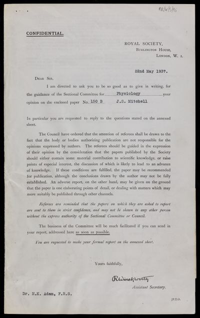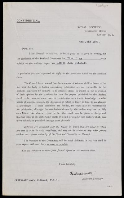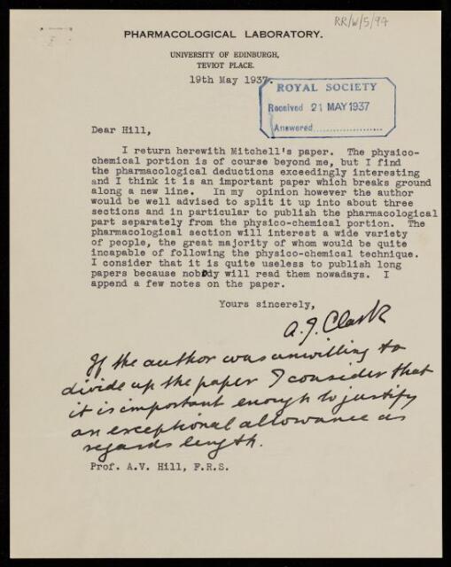 Alfred Joseph Clark, Letter from [Alfred Joseph] Clark to [Archibald Vivian] Hill, regarding a paper 'The photochemistry of proteins with especial reference to the pharmacological and therapeutic actions of ultraviolet radiation, I and II' by [Joseph Stanley] Mitchell, 19 May 1937, RR/W/5/94, The Royal Society Archives, London, https://makingscience.royalsociety.org/items/rr_w_5_94/letter-from-alfred-joseph-clark-to-archibald-vivian-hill-regarding-a-paper-the-photochemistry-of-proteins-with-especial-reference-to-the-pharmacological-and-therapeutic-actions-of-ultraviolet-radiation-i-and-ii-by-joseph-stanley-mitchell, accessed on 14 February 2026