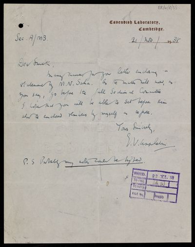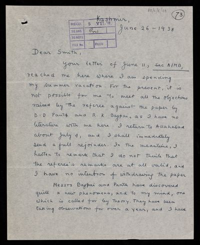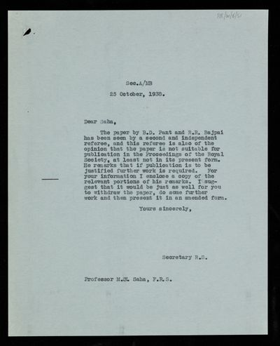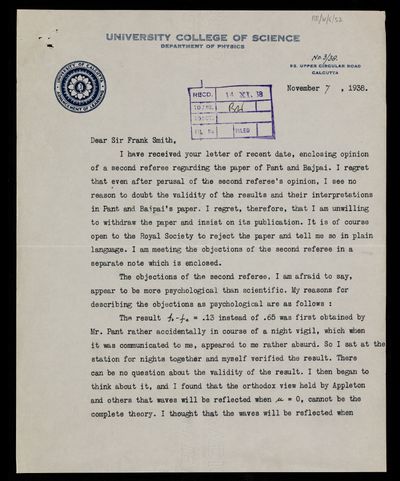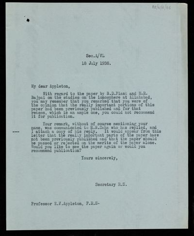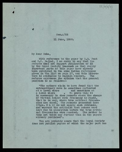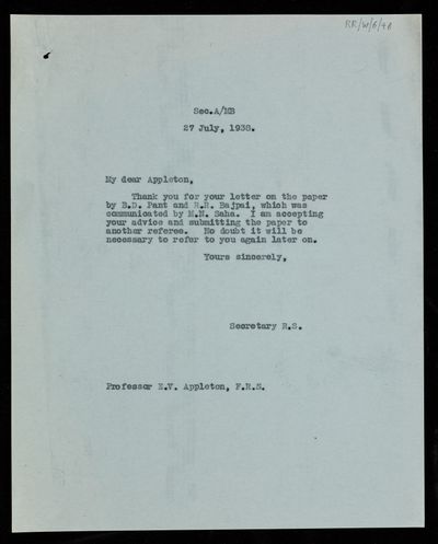 Thomas Lydwell Eckersley, Referee's Report by [Thomas Lydwell] Eckersley on a paper 'Studies on the ionosphere at Allahabad' by B D Pant and R R Bajpai, 30 July 1938, RR/W/6/49, The Royal Society Archives, London, https://makingscience.royalsociety.org/items/rr_w_6_49/referees-report-by-thomas-lydwell-eckersley-on-a-paper-studies-on-the-ionosphere-at-allahabad-by-b-d-pant-and-r-r-bajpai, accessed on 14 December 2025