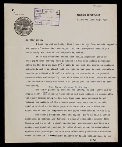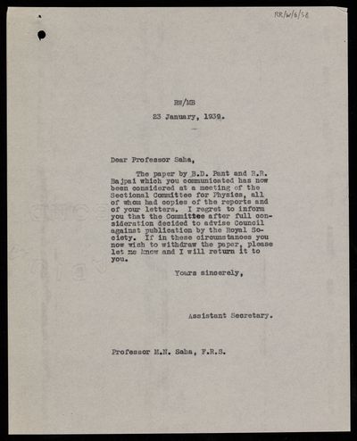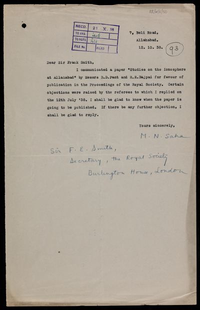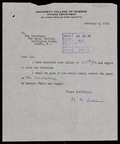 Copy letter from the Assistant Secretary [John David Griffith Davies] to [Meghnad] N Saha, regarding a paper 'Studies on the ionosphere at Allahabad' by B D Pant and R R Bajpai
