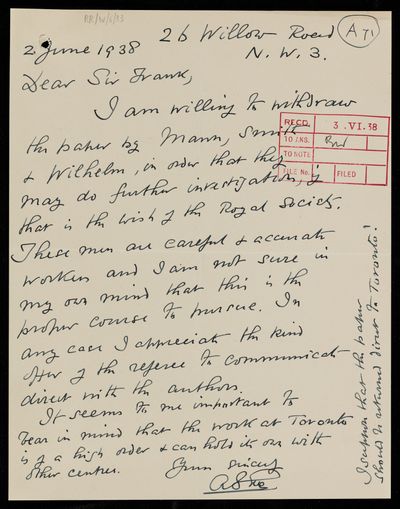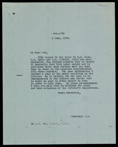Copy letter from the Secretary of the Royal Society to [Arthur Stewart] Eve, regarding a paper 'The influence of magnetic fields on persistent currents in superconductors' by K C Mann, H [Grayson] Smith, and J O Wilhelm