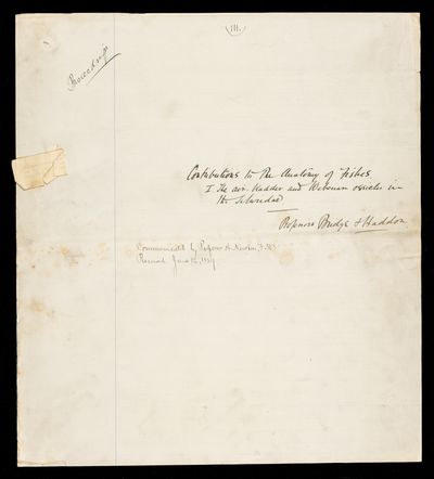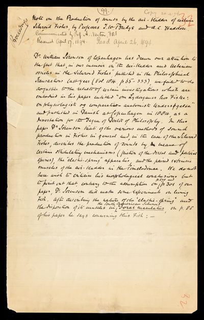 Paper, 'Note on the production of sounds by the air-bladder of certain siluroid fishes' by Thomas William Bridge and Alfred Cort Haddon