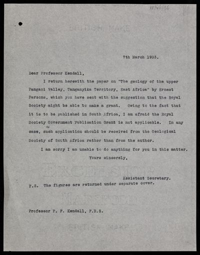 Letter from Assistant Secretary [Ronald Winckworth] to [Percy Fry] Kendall, regarding a paper 'The geology of the upper Pangani Valley, Tanganyika Territory, East Africa' by Ernest Parsons