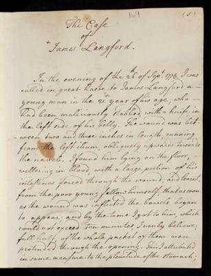Letter, 'The case of James Langford, a cure of wounded intestines' from C Nourse to George Scott