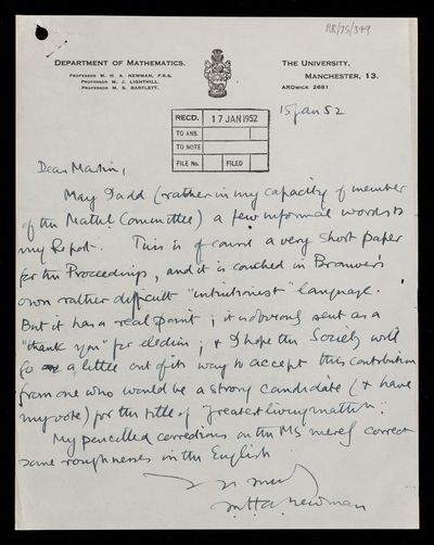 Letter from Maxwell Herman Alexander Newman, on a paper 'An intuitionistic correction of the fixed point theorem on the sphere' by Luitzen Egbertus Jan Brouwer, to D C Martin